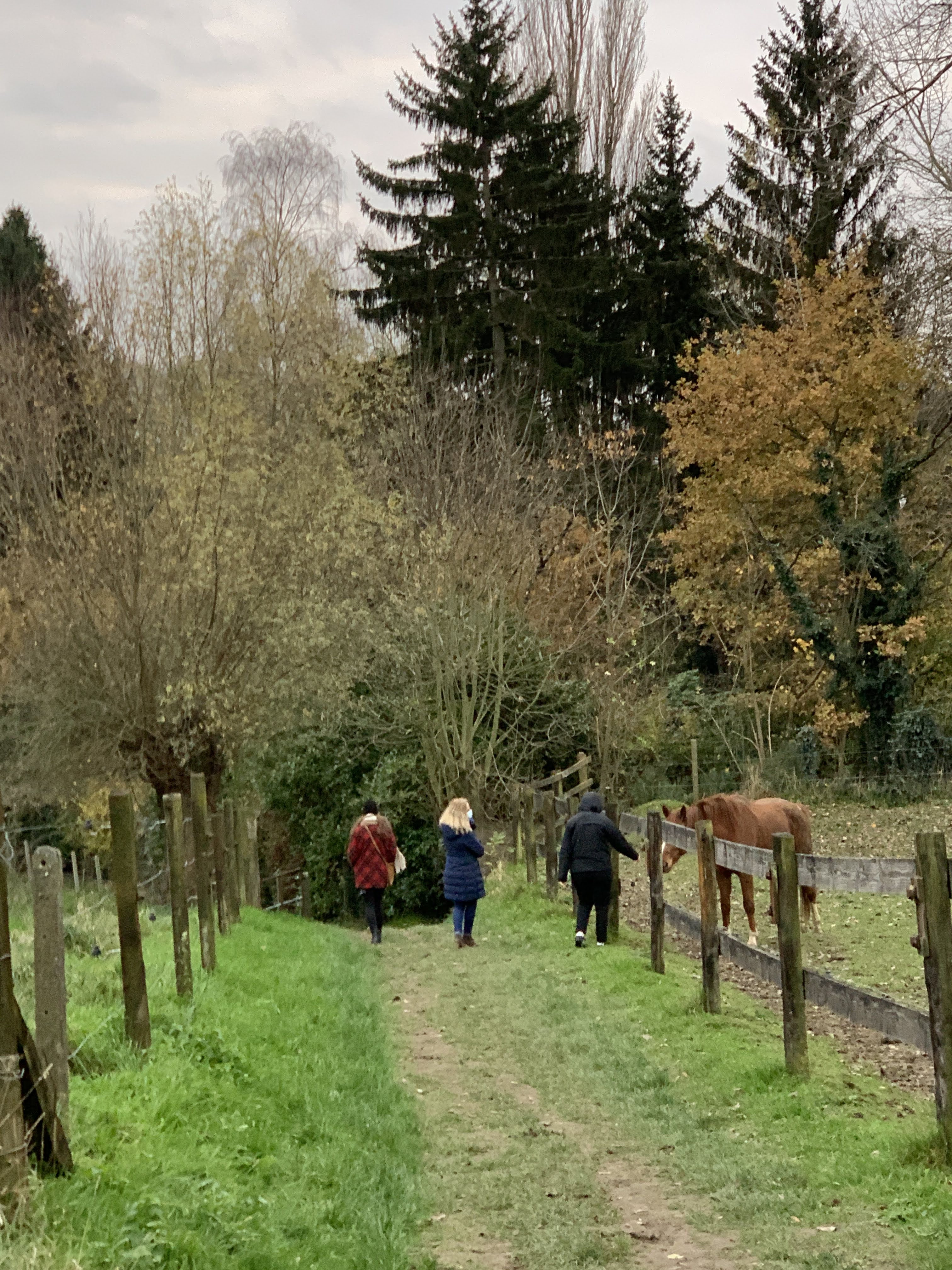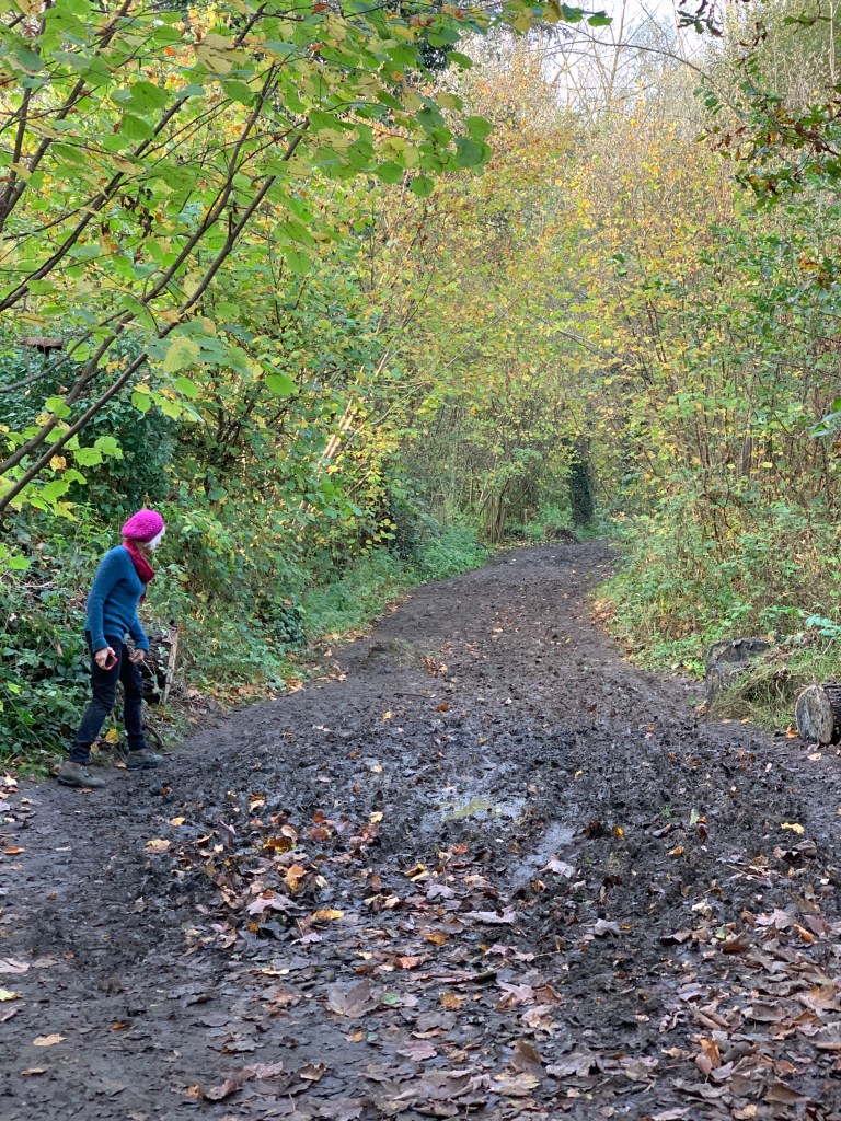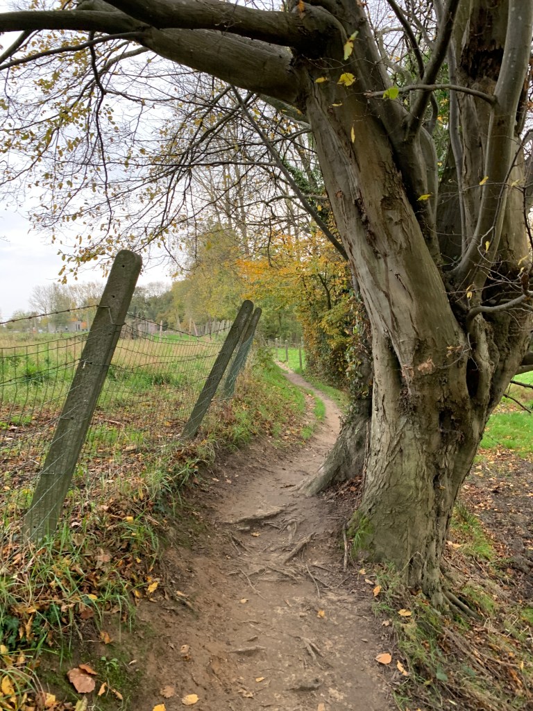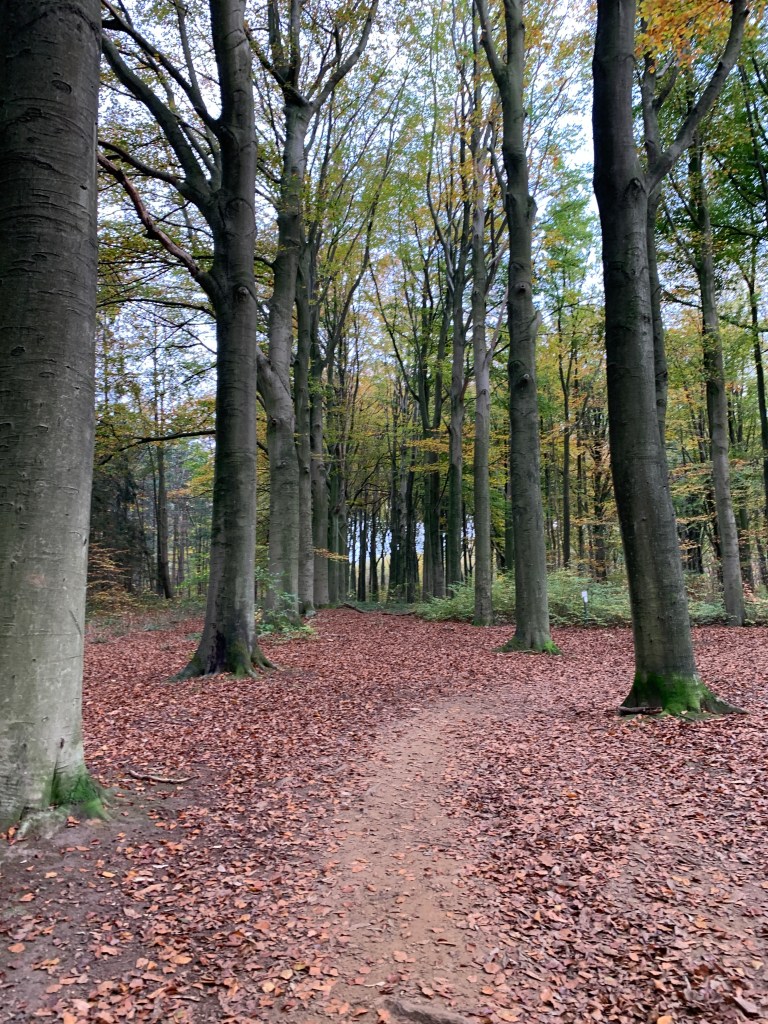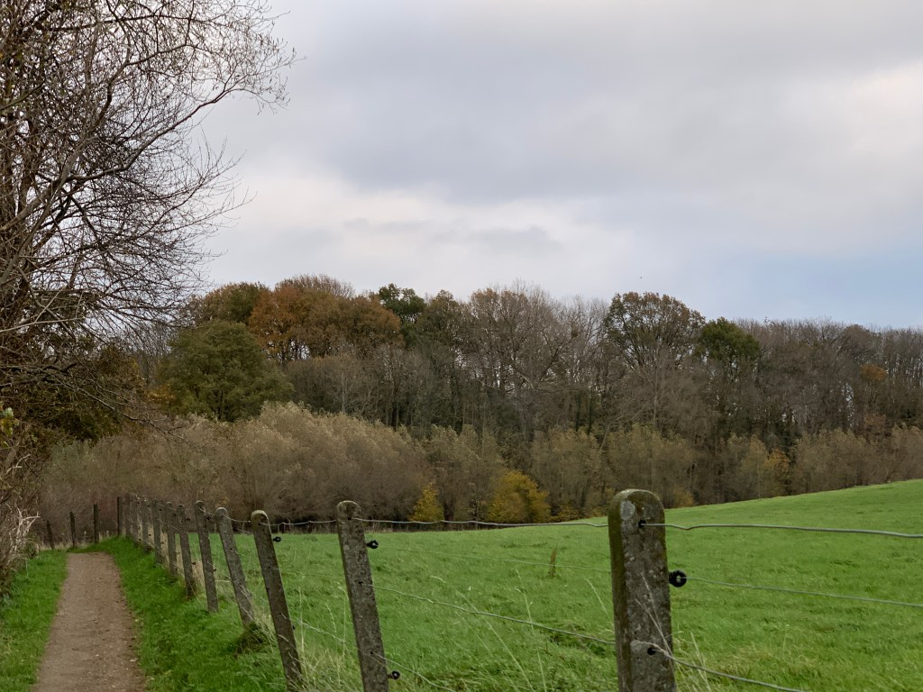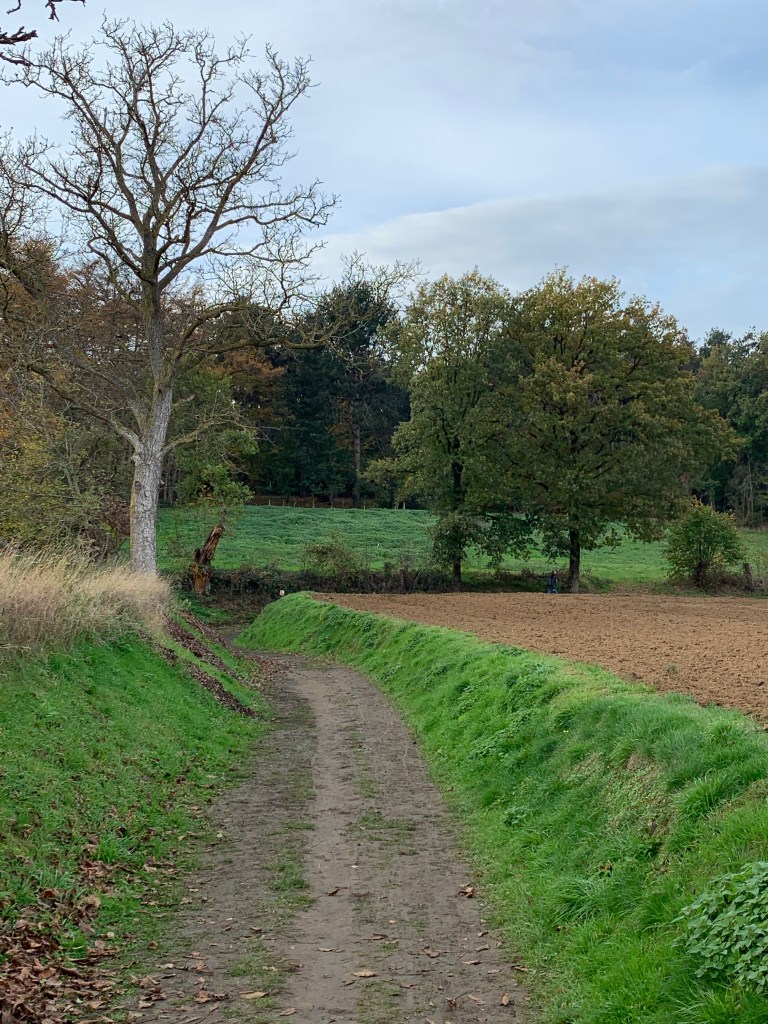 Onder een grijze hemel vatten we onze tocht aan en zakken langs het bospad naast de Koekoek af richting Asbeek.