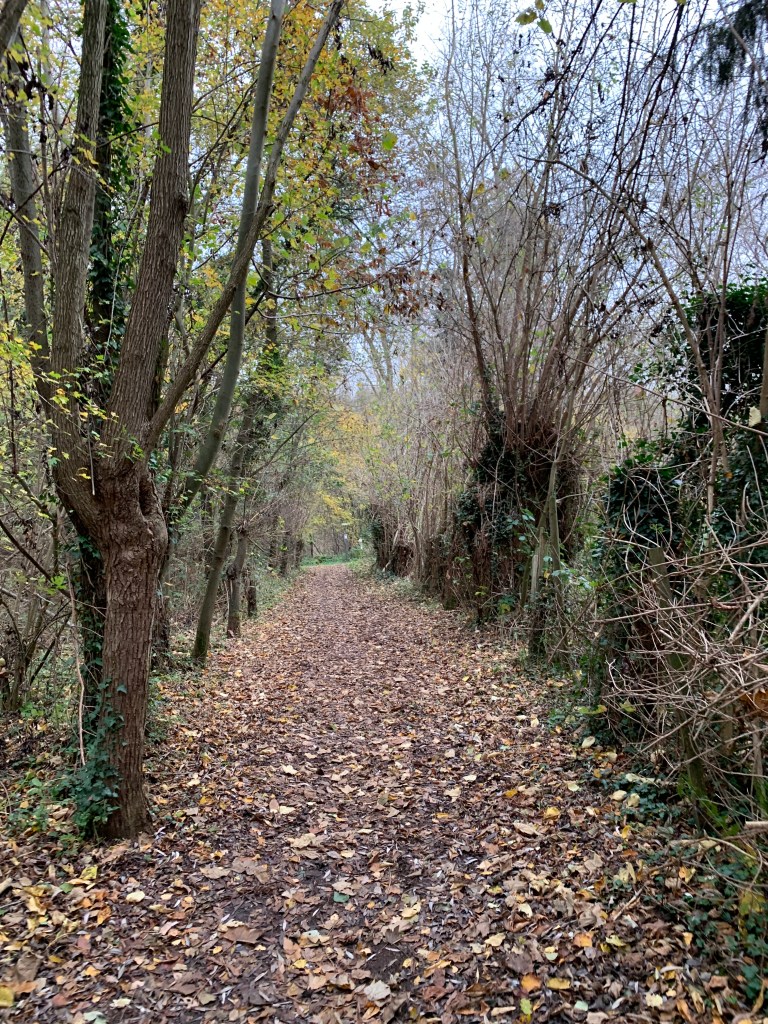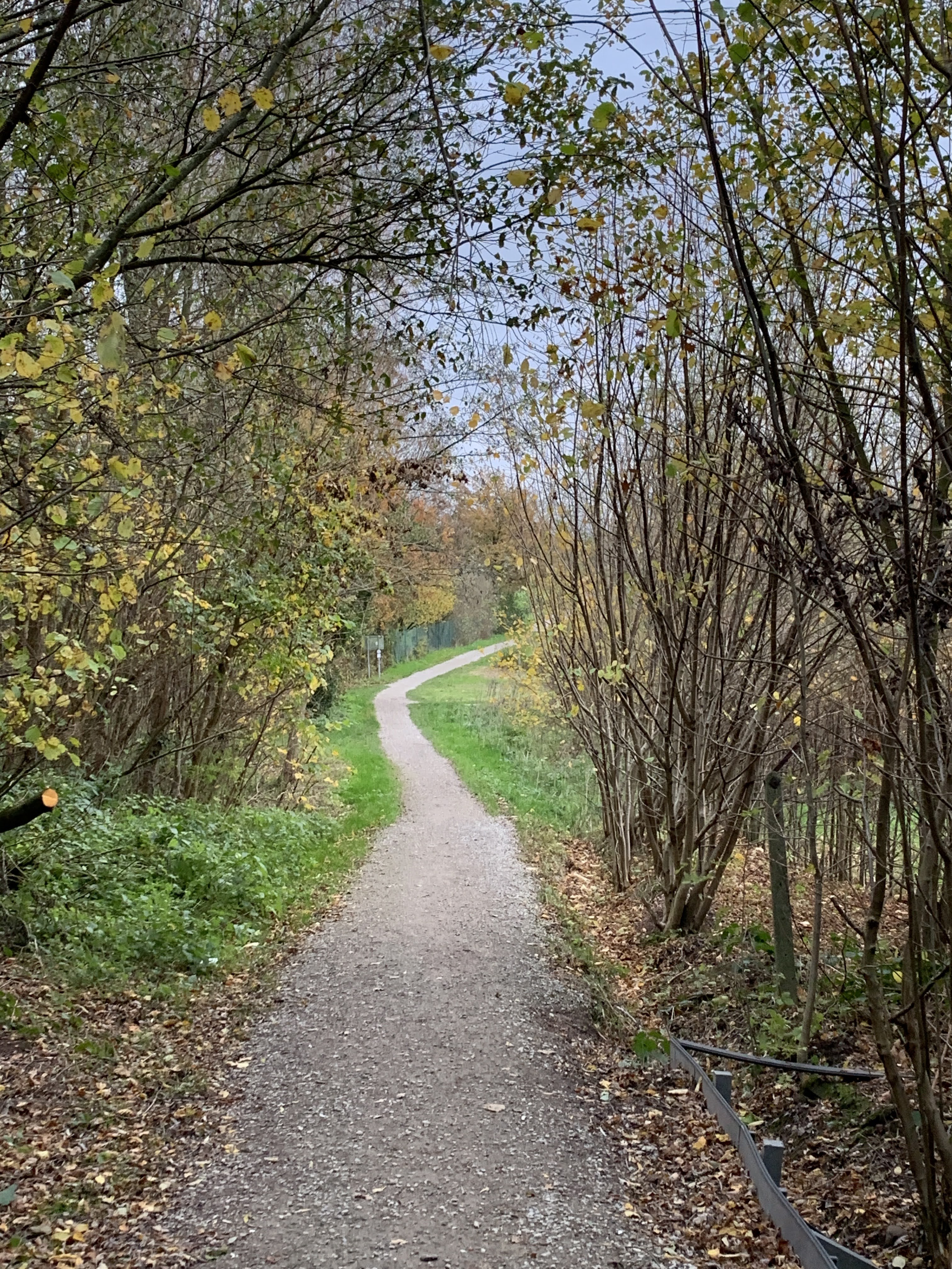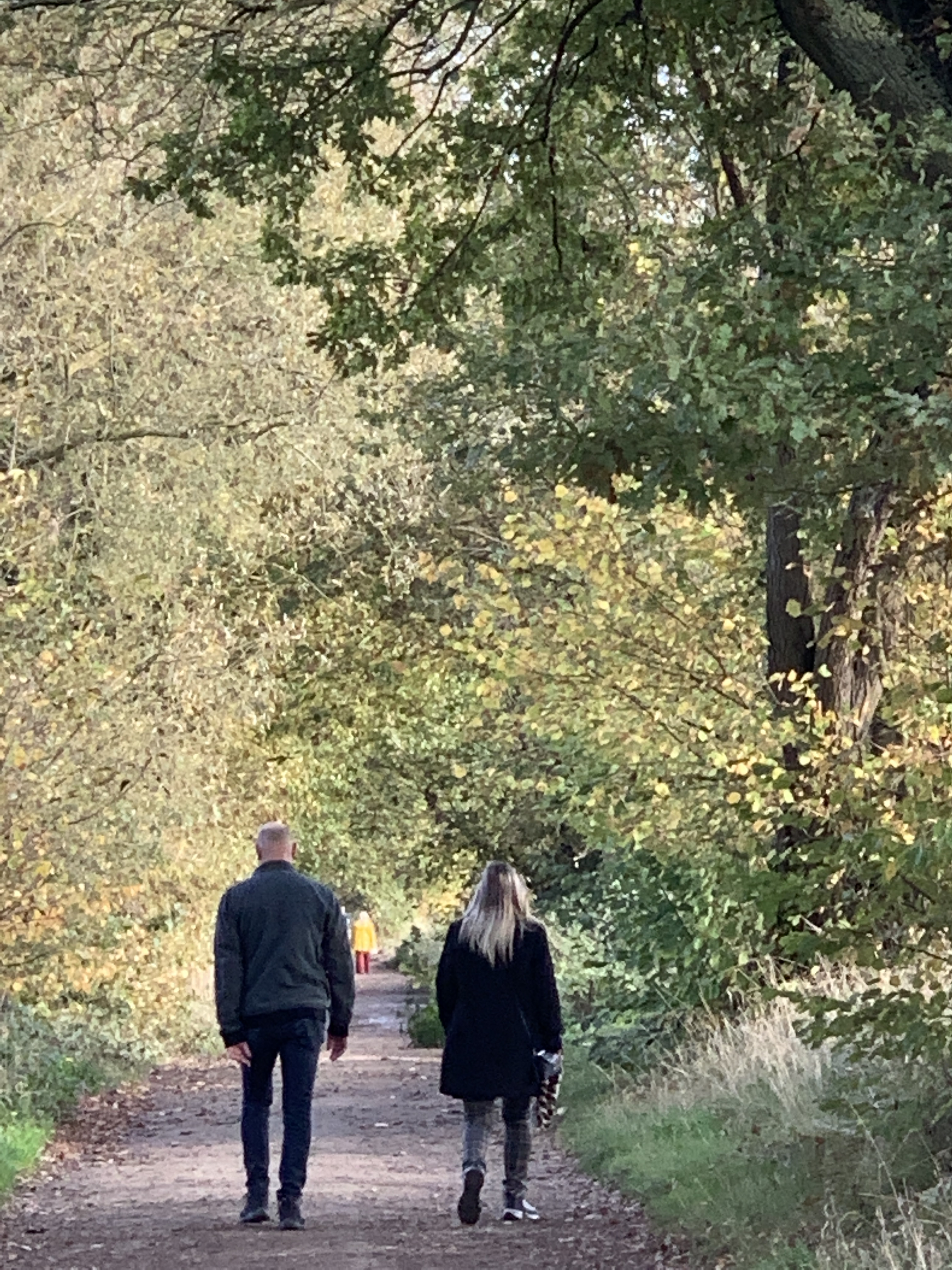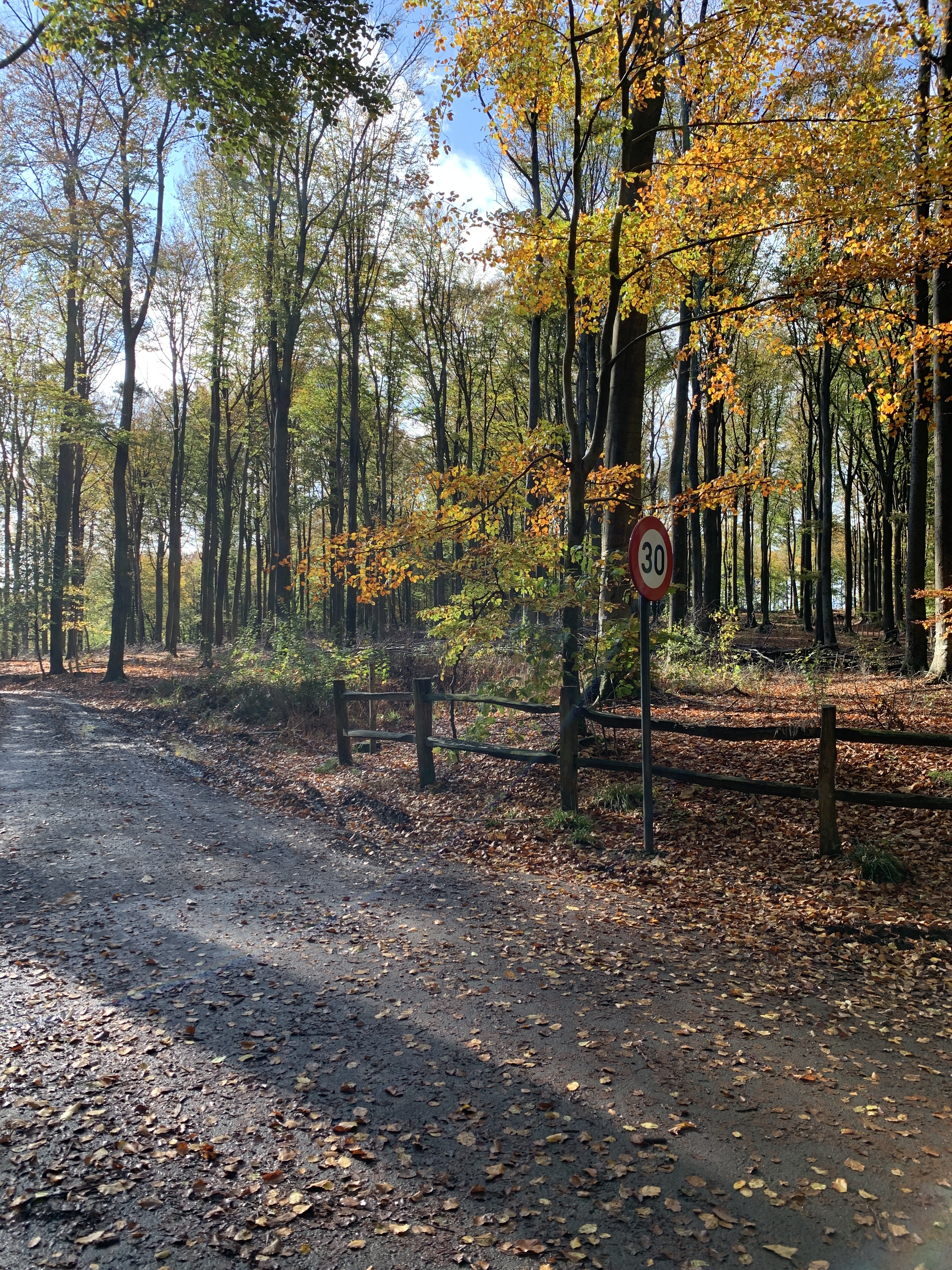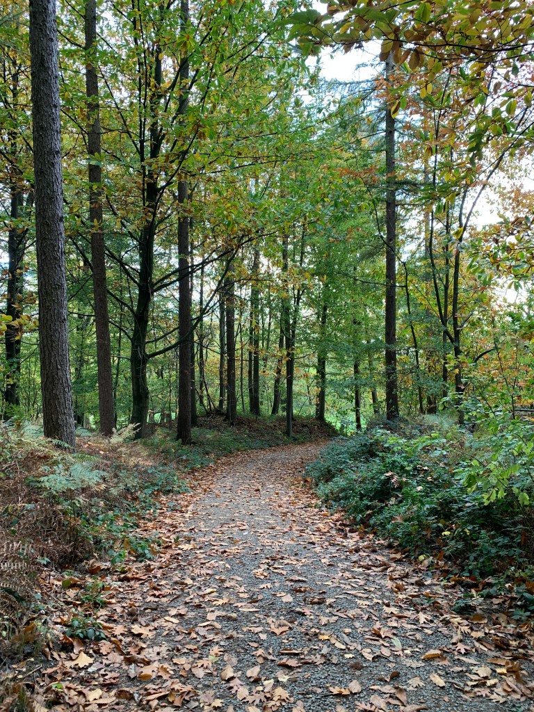 Onder een grijze hemel vatten we onze tocht aan en zakken langs het bospad naast de Koekoek af richting Asbeek.