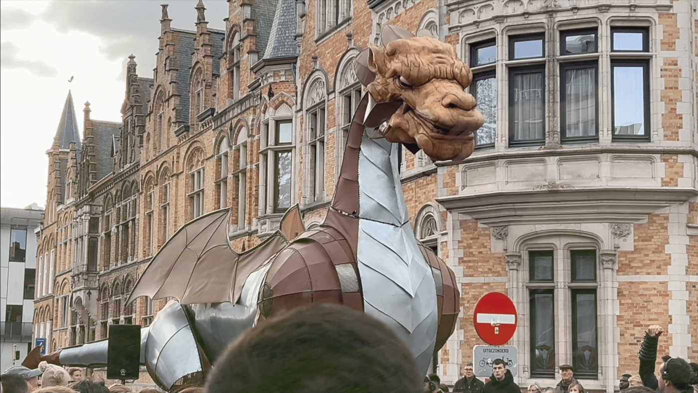 Naarmate de middag overging in de avond, zochten we de intimiteit op bij het Colaertplein. PilkoPilko raakte een gevoelige snaar met The Red Thread, een prachtig klein spektakel. Maar de rust was van korte duur: een enorme, indrukwekkende draak verscheen om ons en de vele andere bezoekers te vergezellen richting het hart van de stad.