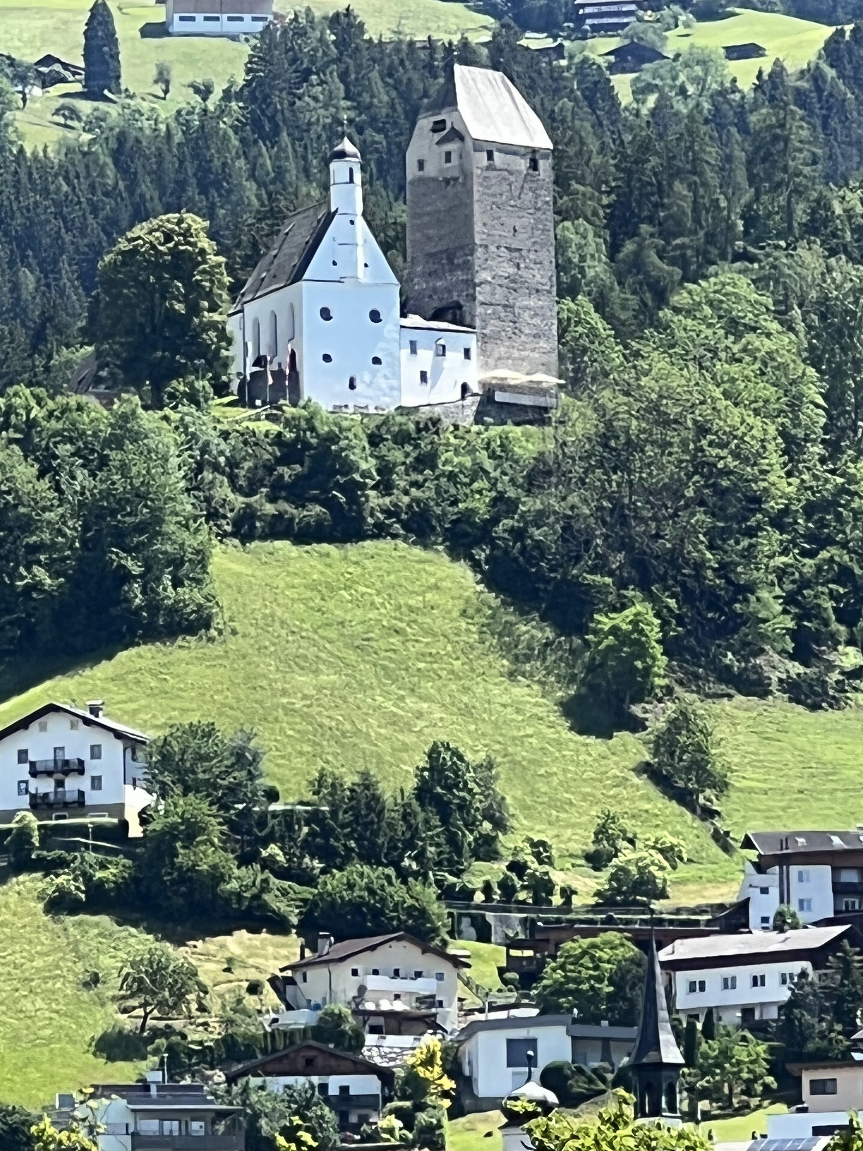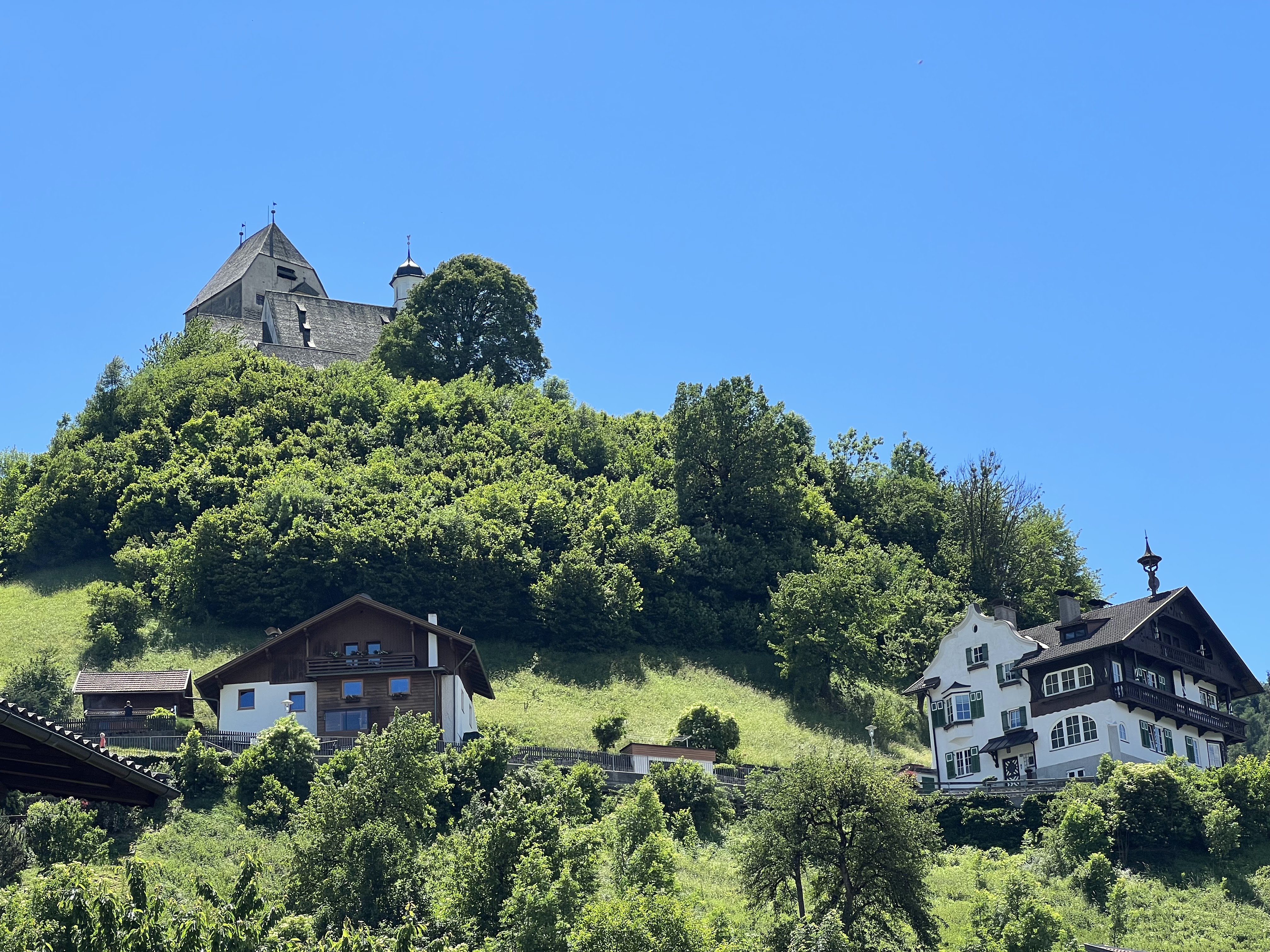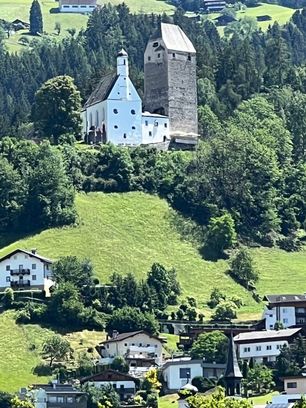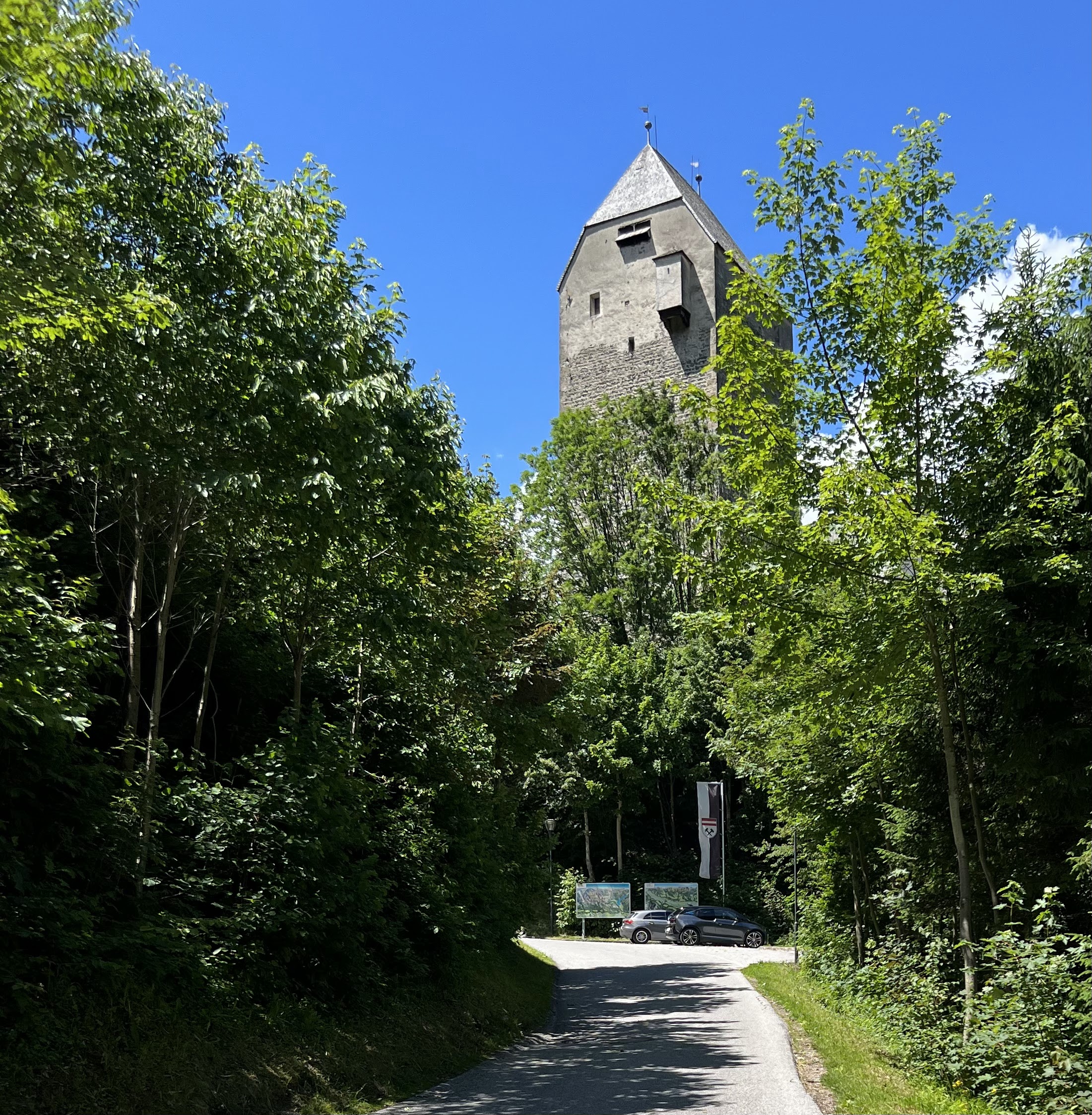 Daarna richten we onze schreden naar Burg Freundsberg. Deze burcht/Donjon torent boven het zilverstadje Schwaz uit en heeft een haast mythische aantrekkingskracht. Na een stevige klim door de buitenwijken van Schwaz bereiken we de hoge grote Donjon geflankeerd door de witte burchtkapel.