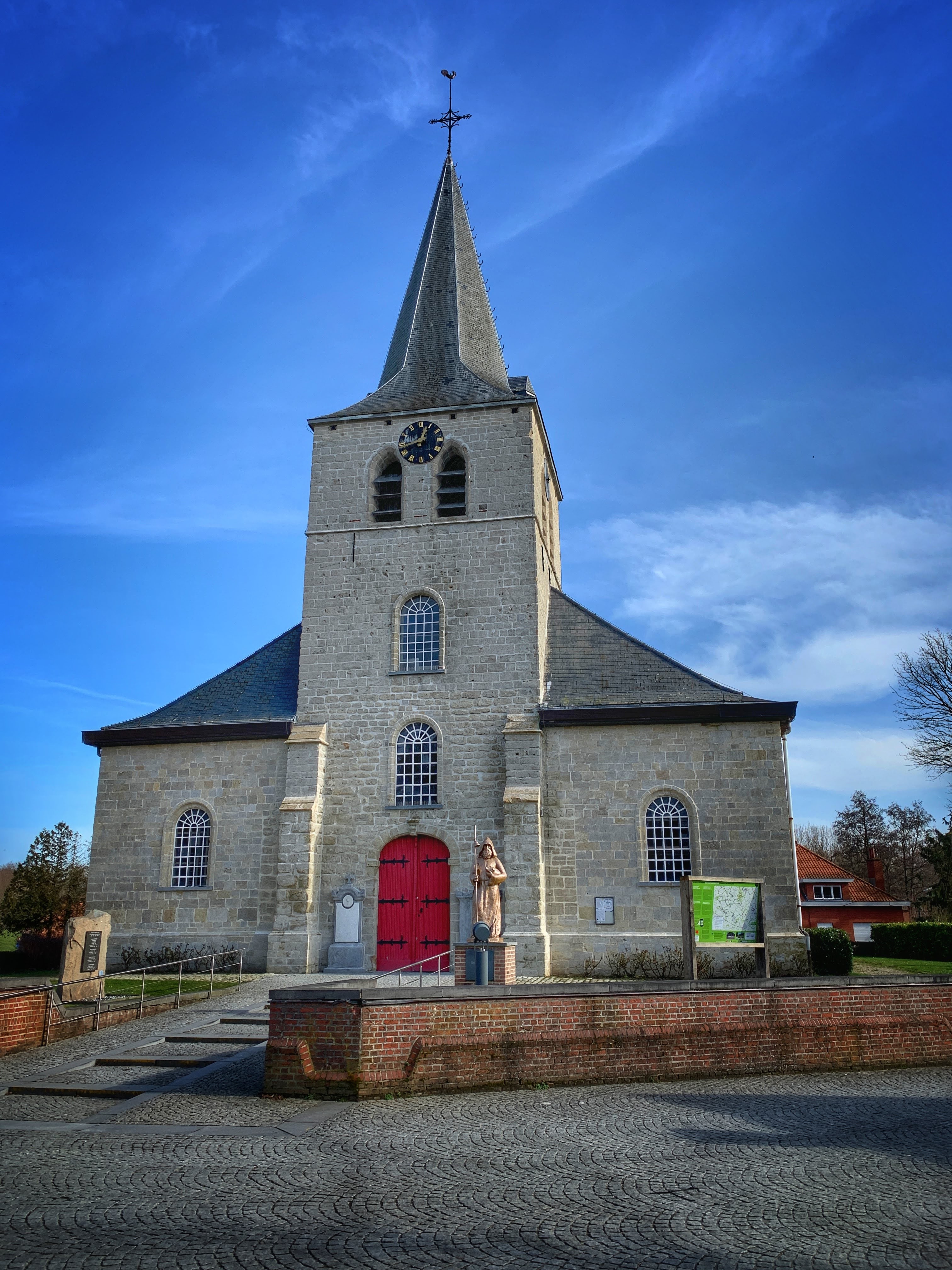 Door wegenwerken en dorpskernvernieuwing dienen we in Strijtem even van de fiets, meteen een mooi moment om de Sint-Martinuskerk in gloed van de ondergaande zon te fotograferen.