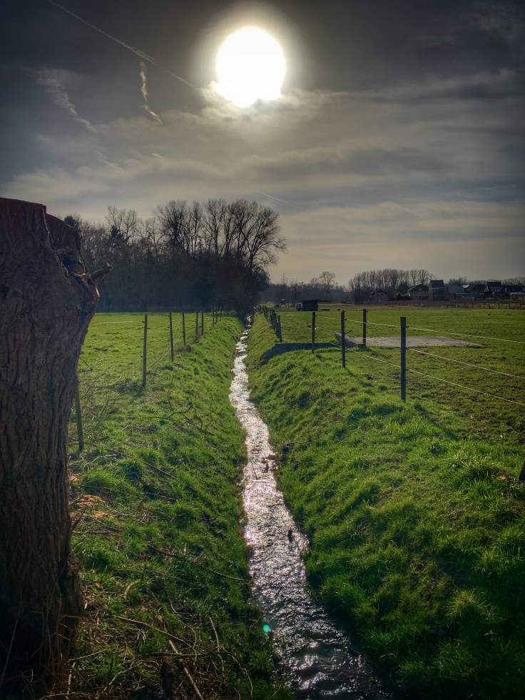 We kruisen opnieuw de Ninoofse steenweg en peddelen voorbij knooppunt 78. Inmiddels is het al 18u15 voorbij en langzaam zakt de zon kimwaarts.